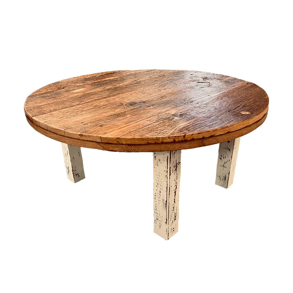 Featuring a top made from locally harvested barnwood and painted square legs, the Hathaway Round Coffee Table is a perfect fit in any cottage or lakehouse.