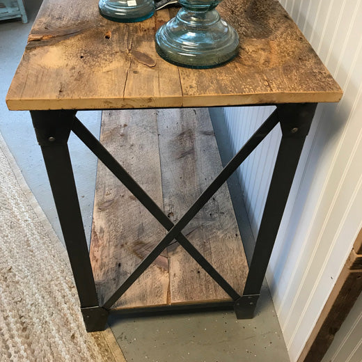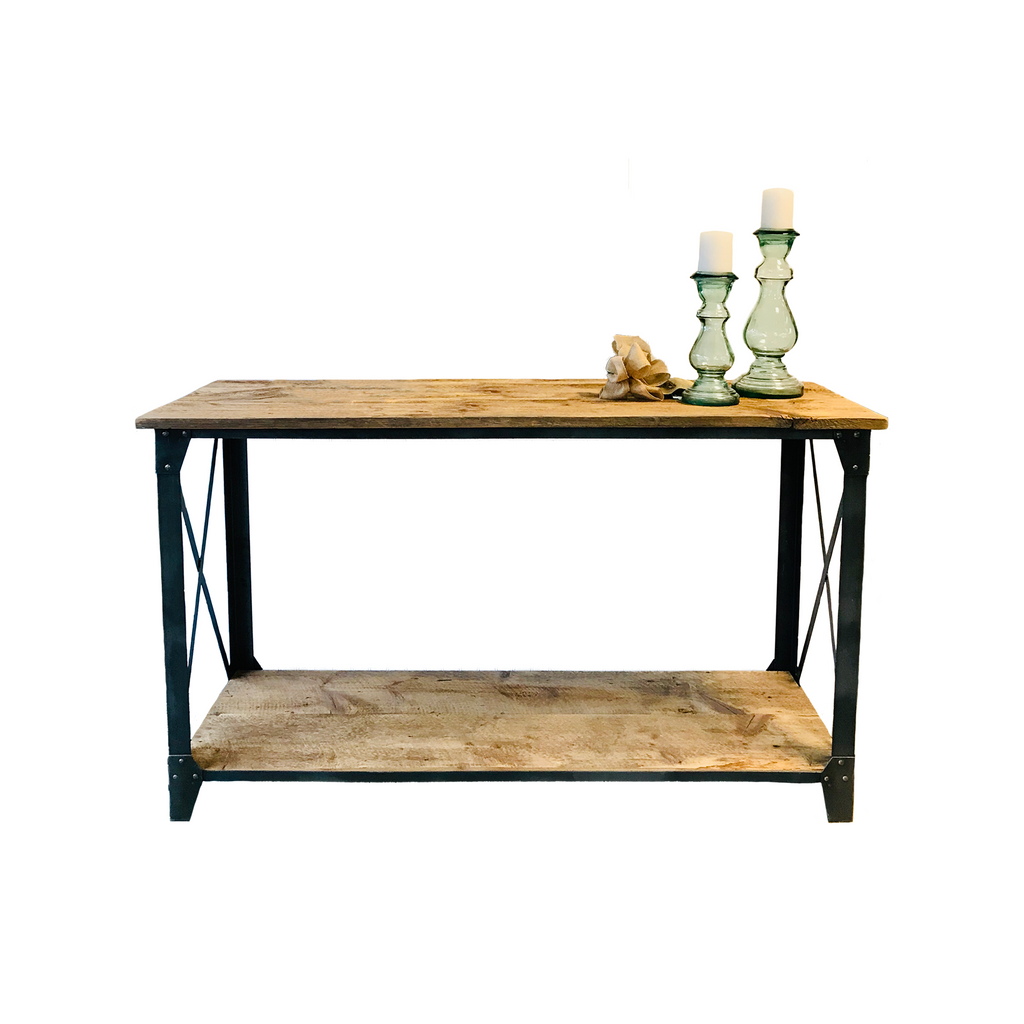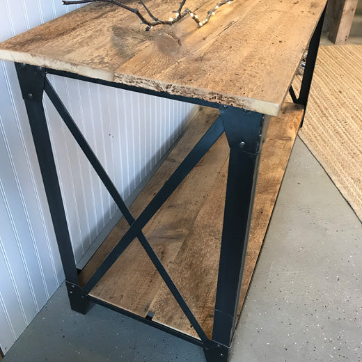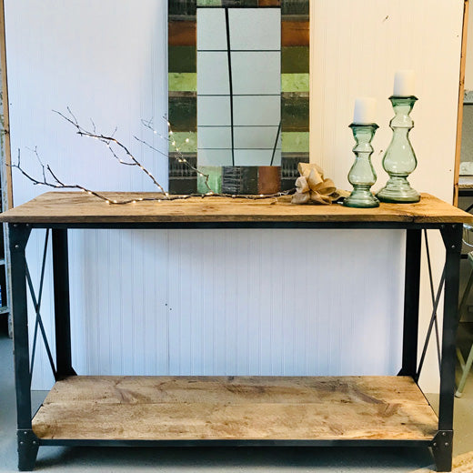This console table offers a modern yet rustic feel with its custom X-style metal base and reclaimed wood top.