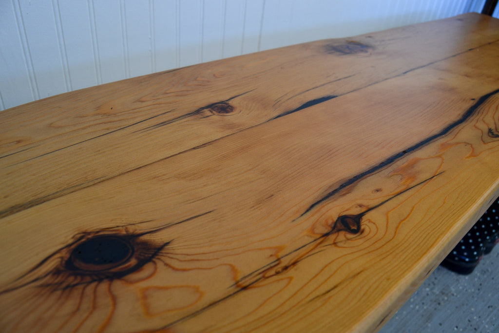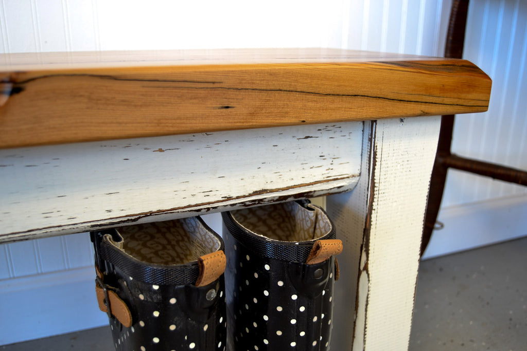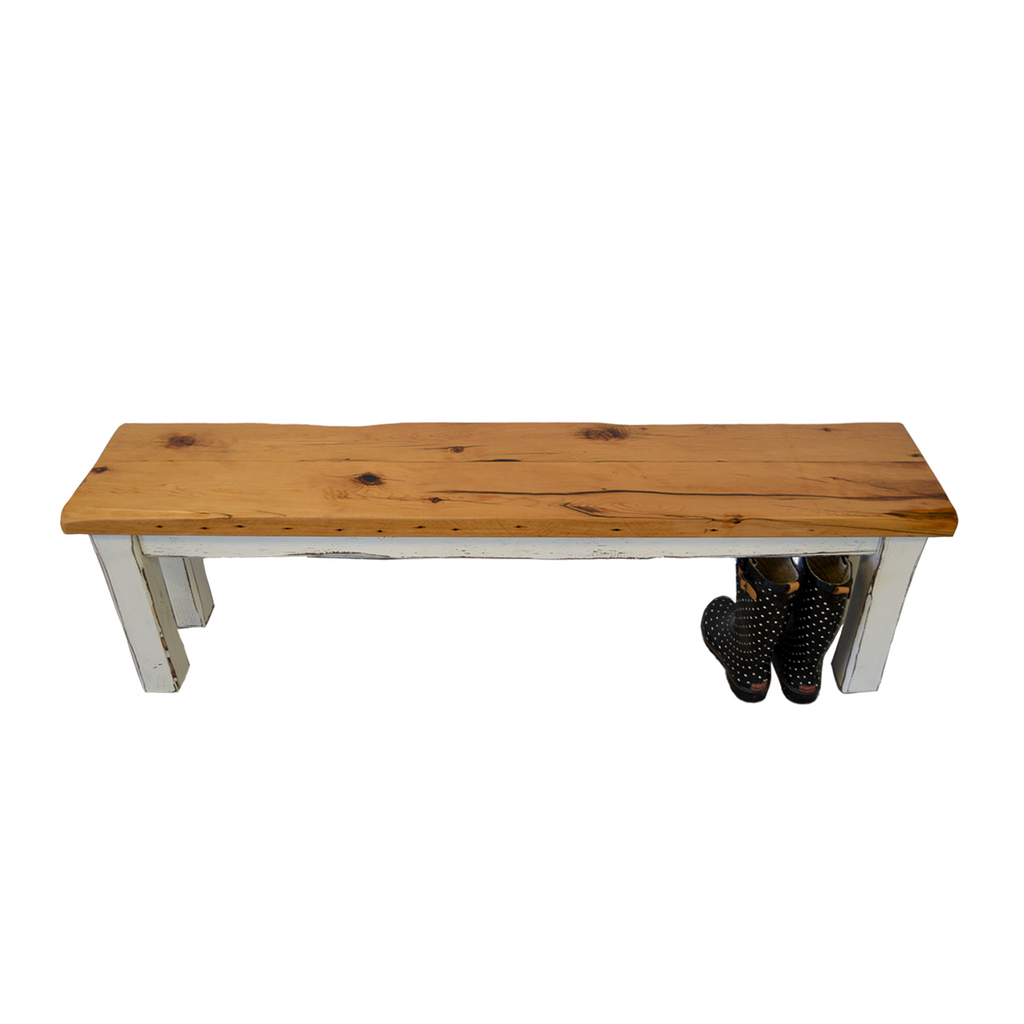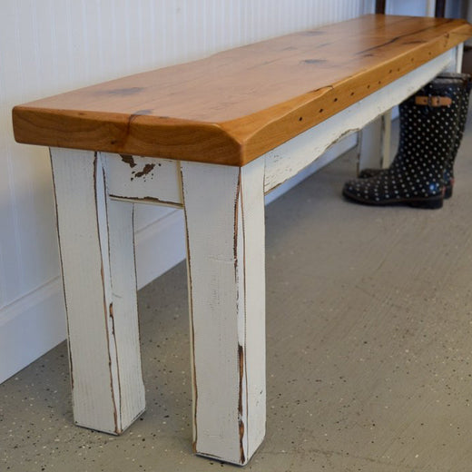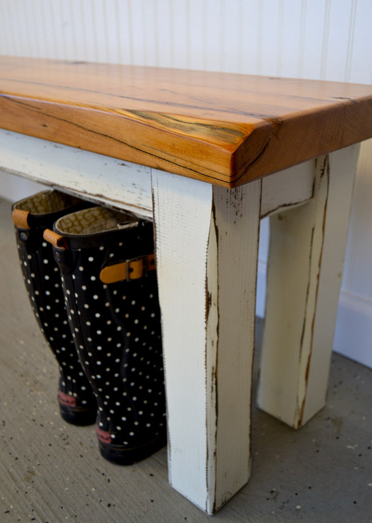 A rustic wood bench with a glossy blonde finished top and white distressed legs, perfect for a cottage mudroom.