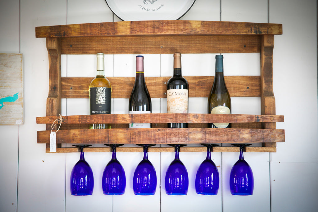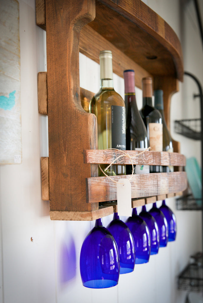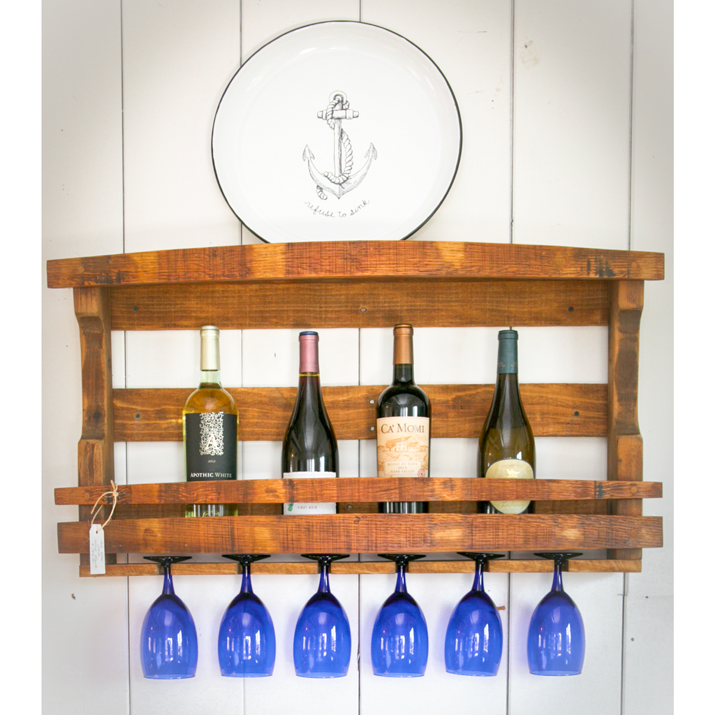 The rack 6-8 bottles and 6 glasses. The top shelf provides a great space for displaying photos and decor.